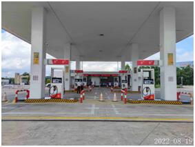 福建省高速公路华陆管理有限公司天宝下行加油站站址位于福建省漳州市芗城区天宝镇漳龙高速公路漳州段K27+440,于2021年5月31日经福建省市场监督管理局批准取得《营业执照》{统一社会信用代码:913500007685878067};于2021年6月29日经漳州市应急管理局批准取得《危险化学品经营许可证》,证书编号:闽漳危经【2014】00126号(换),有效期至2023年8月20日;于2021年7月6日经漳州市商务局批准取得《成品油零售经营批准证书》,编号:油零售证书第961161号,有效期至2026年7月5日,许可经营范围:汽油、柴油零售。 该加油站加油罩棚下设有6台加油机(5台2枪,1台4枪),油罐区内设有4个双层储油罐,其中包括92#汽油罐1个、95#汽油罐1个,容积均为50m3;0#柴油罐2个,容积均为50m3;即折合油罐总容积为150m3(柴油罐容积折半计入油罐总容积),根据《汽车加油加气加氢站技术标准》GB50156-2021的等级划分标准,该加油站划为二级加油站。 |
