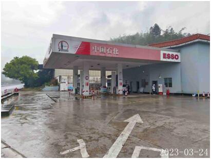 该加油站加油罩棚下设有加油机2台(均为4枪),油罐区设有双层埋地卧式储油罐3个。其中,92#汽油罐1个,容积为30m3;0#柴油罐2个,容积均为30m3;即折合油罐总容积为60m3(柴油罐容积折半计入油罐总容积),根据《汽车加油加气加氢站技术标准》GB50156-2021的等级划分标准,该加油站划为三级加油站。