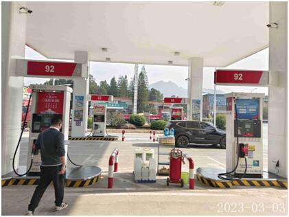 该加油站加油罩棚下设有加油机4台(均为2枪),油罐区设有埋地双层储油罐3个,其中,92#汽油罐1个,容积为25m3;95#汽油罐1个,容积为25m3;0#汽油罐1个,容积为30m3;即折合油罐总容积为65m3(柴油罐容积折半计入油罐总容积),根据《汽车加油加气加氢站技术标准》(GB50156-2021)的等级划分标准,该加油站划为三级加油站。