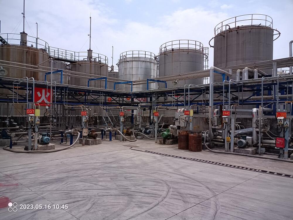 福建兴宇树脂有限公司主要从事聚氨酯树脂(年产干法聚氨酯树脂15000吨、湿法聚氨酯树脂25000吨)、鞋底原液的生产。主要涉及的危险化学品有:N,N-二甲基甲酰胺(DMF)、二苯基甲烷二异氰酸酯(MDI)、碳酸二甲酯、乙酸乙酯、异丙醇、钛酸四异丙酯、聚氨酯树脂、天然气、氮(压缩的)、柴油等。 厂区位于晋江市五里工业园区,厂区东侧为英塘溪,隔英塘溪为道路(兴灵路),隔道路(兴灵路)为满誉(福建)轻工机械发展有限公司;西侧为长成发公司;南侧为道路(欣鑫路);北侧为道路(新雅路),隔道路(新雅路)为雅客(中国)有限公司,北侧还有一架空电力线(杆高为12m);东北侧为伟业城金属制品公司。该公司与最近的居民住宅(位于南侧的英塘社区)距离为170m。 厂区占地面积约52284m2,场地呈规则长方形,在厂区的南侧靠东和南侧靠西各设有一个出入口。厂区分为行政办公区、生产区和生产辅助区三个区域。行政办公区设置有办公楼、传达室等建(构)筑物;生产区设置有2#厂房(丙类)、树脂车间(甲类)、1#仓库(丙类)、2#-1仓库(甲类)、2#-2仓库(丙类)、丙类仓库、乙类仓库、乙类堆棚等建(构)筑物;生产辅助区设置有储罐区、锅炉房、冷库、加热房一、加热房二、供配电室(含配电室、发电机房)、制氮房、消防泵房、消防水池、污水处理站、环保在线监测房、风机房、卫生间等建(构)筑物;同时,在厂区的西南侧设有一倒班宿舍楼。 室外埋地储罐区共设置14个立式固定顶罐,用于储存聚酯多元醇、N,N-二甲基甲酰胺(DMF)、碳酸二甲酯、乙二醇、1,4-丁二醇、二甘醇等物料。 |
