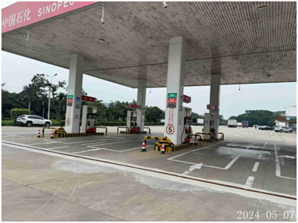 该加油站加油罩棚下设有加油机6台(均为4枪),油罐区设油罐4个(均为SF双层储油罐)。其中汽油罐2个,罐容均为50m3,分别存储92#、95#汽油;0#柴油罐2个,罐容均为50m3,折合油罐总容积为150m3(柴油罐容积折半计入油罐总容积),根据《汽车加油加气加氢站技术标准》GB50156-2021的等级划分标准,该加油站划为二级加油站。