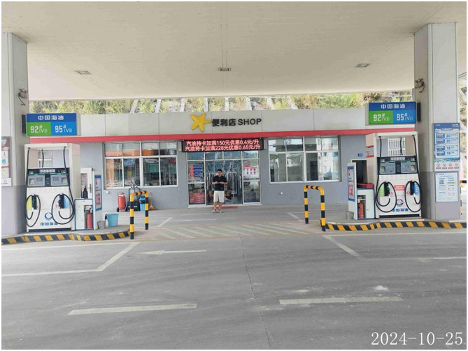 中海油销售福建有限公司华安沙建加油站站址位于福建省漳州市华安县沙建镇建美村(省道219西港线427公里100米),于2024年8月13日经漳州市市场监督管理局批准取得《营业执照》{统一社会信用代码:91350629MA32F5712E};于2024年8月13日经漳州市应急管理局批准取得《危险化学品经营许可证》,证书编号:闽漳危经〔2019〕0001(换)号,有效期至2025年1月9日;于2024年8月22日经漳州市商务局批准取得《成品油零售经营批准证书》,编号:油零售证书第963411号,有效期至2029年8月21日,许可经营范围:汽油、柴油零售。 该加油站加油罩棚下设有加油机4台(均为4枪),油罐区设有双层埋地卧式储油罐4个,其中92#汽油罐1个,容积为30m3;95#汽油罐1个,容积为30m3;0#柴油罐2个,容积均为30m3;即折合油罐总容积为90m3(柴油罐容积折半计入油罐总容积),根据《汽车加油加气加氢站技术标准》GB50156-2021的等级划分标准,该加油站划为三级加油站。 |