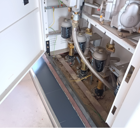 该加油站现有主要设施包括:一座站房(内设:营业室、办公室、值班室、配电间、机油零售间、洗手间等)、一座辅助用房1(内设:机油储存间(用于储存机油桶、并设有1个危废暂存柜)、发电机房(设有1台柴油发电机))、一座辅助用房2(电磁炉厨房)、一座加油棚、一个埋地油罐区。加油棚下设4座加油岛,共设置4台单机4枪加油机。油罐区设有4个埋地卧式油罐,分别为1个30m3柴油罐、3个25m3汽油罐,折合油罐总容积(柴油罐容积折半计入)90m3,为三级加油站。该加油站设有卸油和加油油气回收系统。