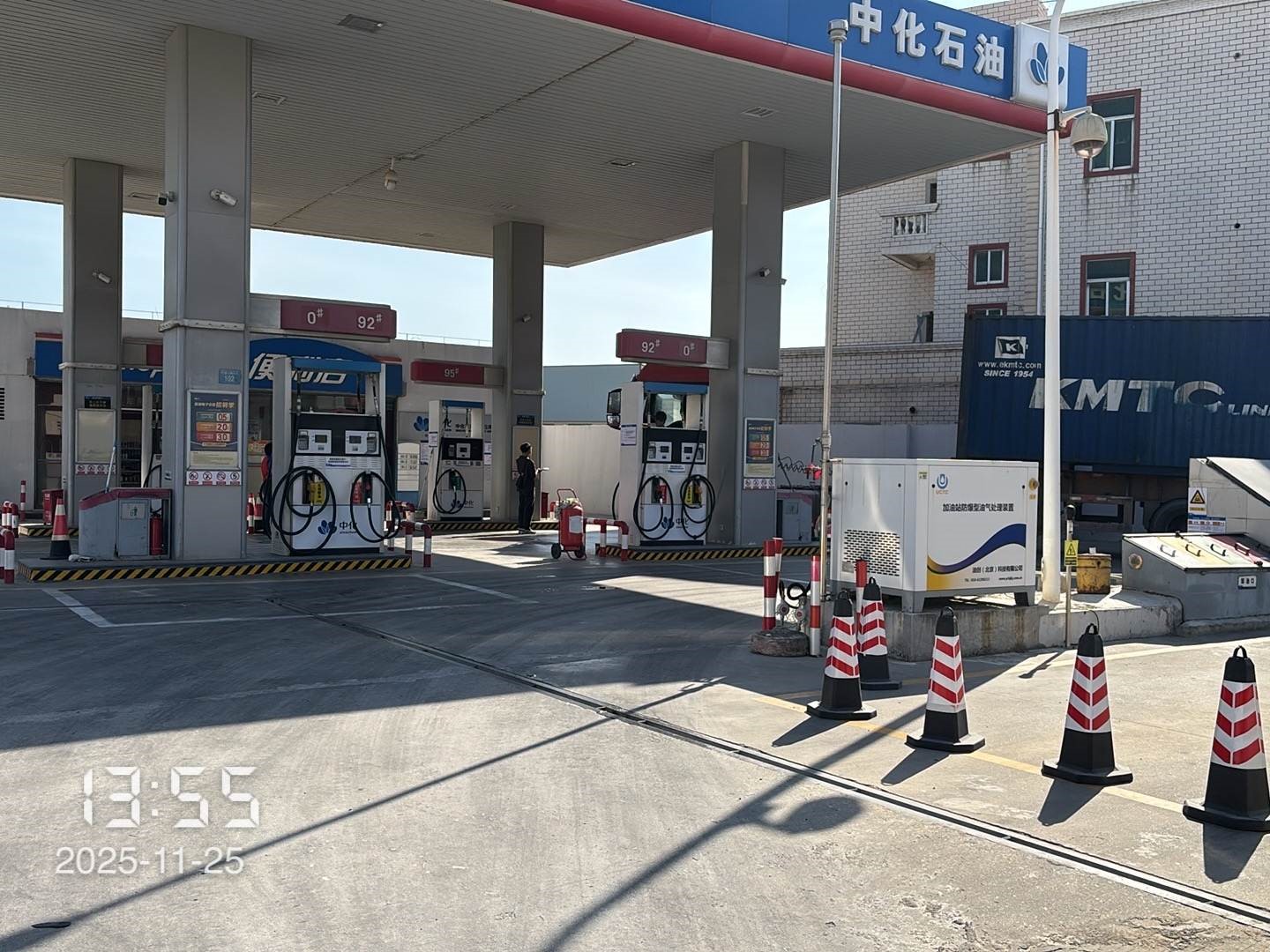 该加油站油罐区设有3个埋地卧式单层钢制油罐(罐区已设置防渗罐池),其中容积为30m3的0#柴油罐1个,容积为30m3的92#汽油罐1个,容积为15m3的95#汽油罐1个,折合油罐总容积为60m3(柴油罐容积折半计入油罐总容积),为三级加油站。该加油站设有汽油卸油和加油油气回收系统,并设有三次油气回收处理装置。