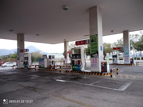 该加油站现有主要设施包括:一座站房(内设:便利店、办公室、配电室、洗手间等)、一座辅助用房(空置)、一座加油棚、一个埋地油罐区。加油棚下设7座加油岛,共设置2台单机2枪加油机,4台单机4枪加油机,1台柴油尾气处理液加注机。油罐区设有4个埋地卧式油罐,分别为2个40m3柴油罐、2个40m3汽油罐,折合油罐总容积(柴油罐容积折半计入)120m3,为二级加油站。该加油站设有卸油和加油油气回收系统。