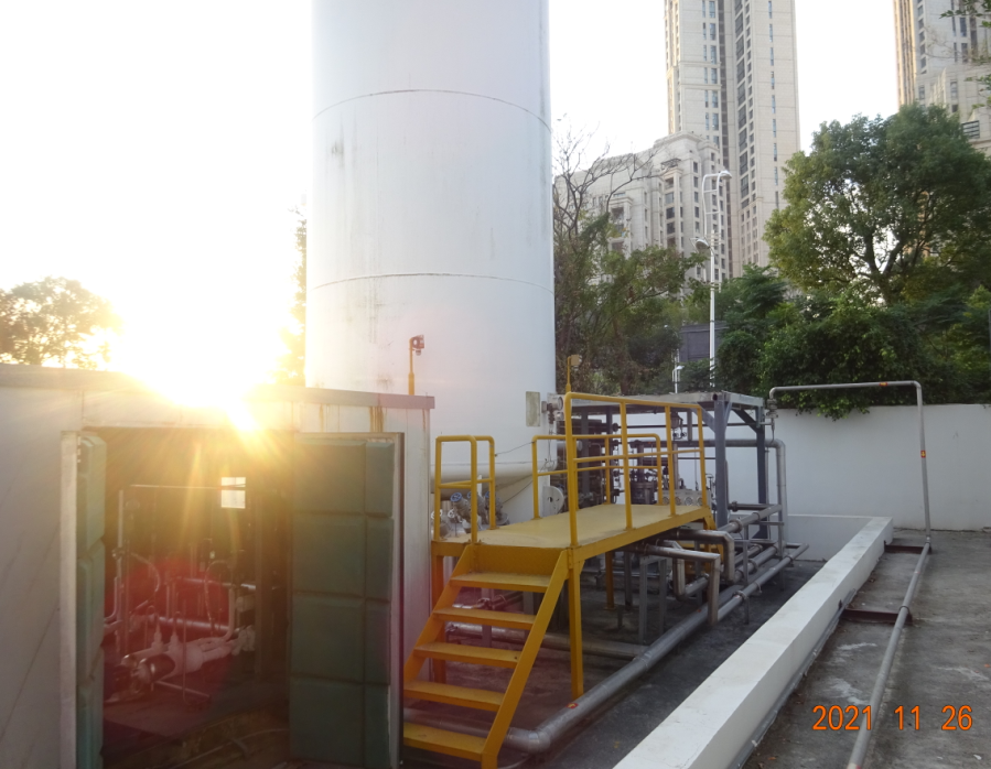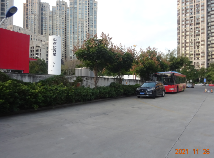 中海石油(厦门)新能源有限公司会展加气站位于厦门市思明区会展北路1号之二,属于中石化与中海油合作经营的加油加气合建站,中石化经营加油业务,中海油经营加气业务。该站于2012年7月经过消防验收后投入使用,于2015年12月30日取得福建省燃气汽车加气经营许可证,证书编号:2039号。 该站站内现有主要设施包括:一座站房(办公室、营业室、配电室、卫生间等)、一座加油棚(加油棚下设4台加油机和2台加气机),一个埋地油罐区以及L-CNG加气设施区。埋地油罐区设有3个容积20m³的埋地卧式储油罐,储油罐总容积为60m3;加气设施区设有1个容积60m3的LNG储罐和1个容积3.68m3的CNG储气瓶组。根据《汽车加油加气加氢站技术标准》(GB50156-2021)第3.0.17条规定,该站为二级加油与L-CNG加气合建站。 该站加气设施包括:LNG罐区(内设卸车泵橇、LNG储罐、LNG气化器、柱塞泵等)、CNG储气瓶组、EAG放散系统、2台CNG加气机和配套的仪表气和程控盘。 |