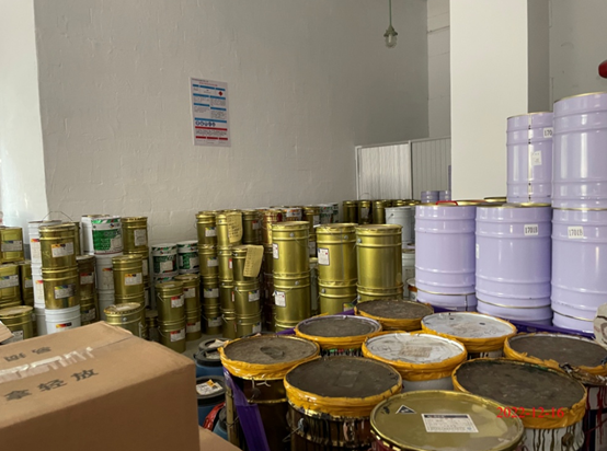 生产区布置有甲类埋地储罐区、消防水池、甲类仓库一、甲类仓库二、生产车间、丙类仓库、全厂低压配电室和清净下水池。生产车间东侧、北侧、西北侧、西侧分别为丙类仓库、甲类仓库一、甲类埋地储罐区、甲类仓库二。丙类仓库与东侧围墙之间布置有空压机,丙类仓库内设置有生产车间低压配电室(采用防火墙分隔)。甲类仓库一和甲类仓库二各分隔成3个防火分区。甲类埋地储罐区设置了6个埋地卧式储罐,单罐容积均为80㎥。