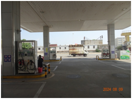 该加油站位于南安市石井镇老港村西环一路180号,站区使用权面积为3333m2。该加油站北侧为省道201线(主干路),西侧为泉州新明都石业发展有限公司的综合楼(民用建筑,二类保护物)和石材厂房(丁类厂房),南侧为南安市新华都石业发展有限公司的办公楼(民用建筑,三类保护物)和石材厂房(丁类厂房),东侧隔露天石材堆场为南安市石井恒星石材厂的厂房(丁类厂房)。站区周围50m范围内没有重要公共场所和大型建筑物。加油站东北侧有一杆装变压器,北侧有一架空电力线经过,未跨越加油站的作业区。