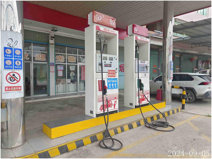 平和县坂仔心田加油站站址位于福建省平和县坂仔镇心田村商市92号,于2024年08月12日经平和县市场监督管理局批准取得《营业执照》{统一社会信用代码:91350628L10269516P};于2024年08月13日经漳州市应急管理局批准取得《危险化学品经营许可证》,证书编号:闽漳危经[2016]0070(换)号,有效期至2025年06月01日;于2024年8月20日经漳州市商务局批准取得《成品油零售经营批准证书》,编号:油零售证书第963181号,有效期至2029年8月19日,许可经营范围:汽油、柴油零售。 该加油站加油罩棚下设有2台加油机(均为两枪);油罐区设有双层油罐3个,其中包括1个停用汽油罐(卸油口已用盲板封堵),容积为10m3;92#汽油罐1个,容积为10m3;0#柴油罐1个,容积为10m3;即折合油罐总容积为25m3(柴油罐容积折半计入油罐总容积),根据《汽车加油加气加氢站技术标准》GB50156-2021的等级划分标准,该加油站划为三级加油站。 |