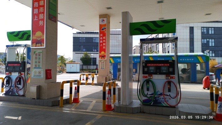 该加油站油罐区设有3个埋地卧式SF双层油罐,其中容量为30m3的0#柴油罐1个,容量为30m3的92#汽油罐1个,容量为30m3的95#汽油罐1个,折合油罐总容积为75m3(柴油罐容积折半计入油罐总容积),为三级加油站。该加油站设有汽油卸油和加油油气回收系统。